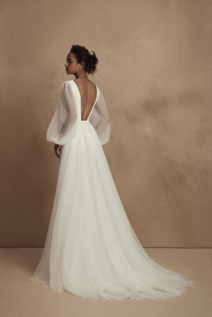 De Amy trouwjurk van Wona Concept is een moderne bruidsjurk met een tijdloze uitstraling. Deze elegante jurk is uitgevoerd in een soepel vallende stof met een diepe V-halslijn die het bovenlichaam prachtig accentueert. De transparante ballonmouwen van zachte tule geven een speels en romantisch effect.