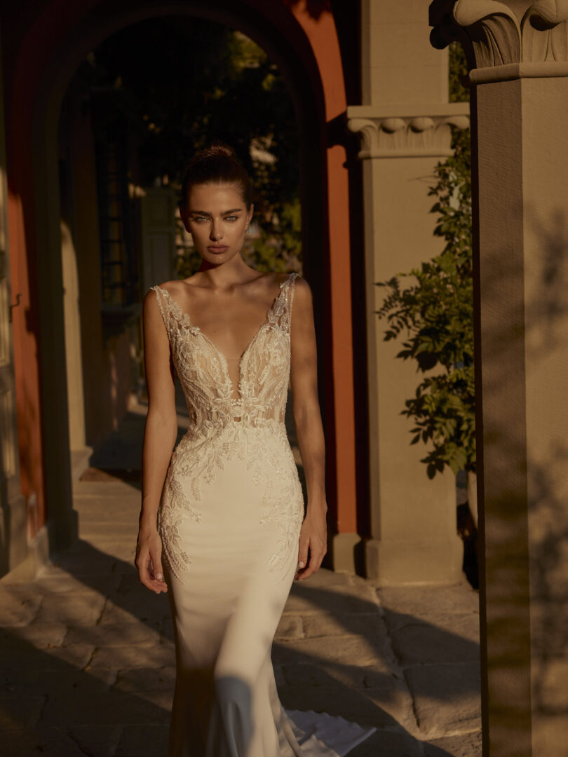De December trouwjurk is ontworpen om het silhouet prachtig te accentueren. De nauwsluitende fit-and-flare pasvorm is gemaakt van soepele crêpe die de vormen stijlvol volgt. Het semi-transparante lijfje met diep V-decolleté is versierd met kant en fijne pailletten voor een subtiele glinstering. Aan de achterkant zorgt een opvallende V-rug voor een moderne look. De sleep op chapel-lengte maakt deze jurk compleet voor een indrukwekkend moment richting het altaar.