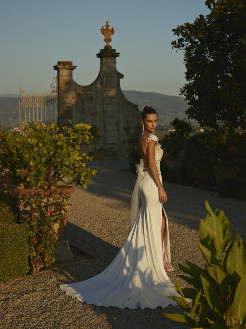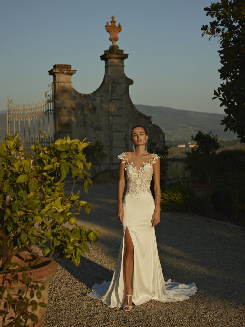 Deze moderne trouwjurk van Modeca valt op door haar kanten details. De stretch satijnen rok heeft een subtiele split, wat zorgt voor een sierlijke loop. Op het transparante lijfje en de kapmouwtjes zijn delicate 3D bloemen aangebracht die zorgen voor structuur en een stijlvolle touch. De rug is laag uitgesneden en wordt geaccentueerd met een luchtige tule strik, wat het geheel een opvallend karakter geeft.