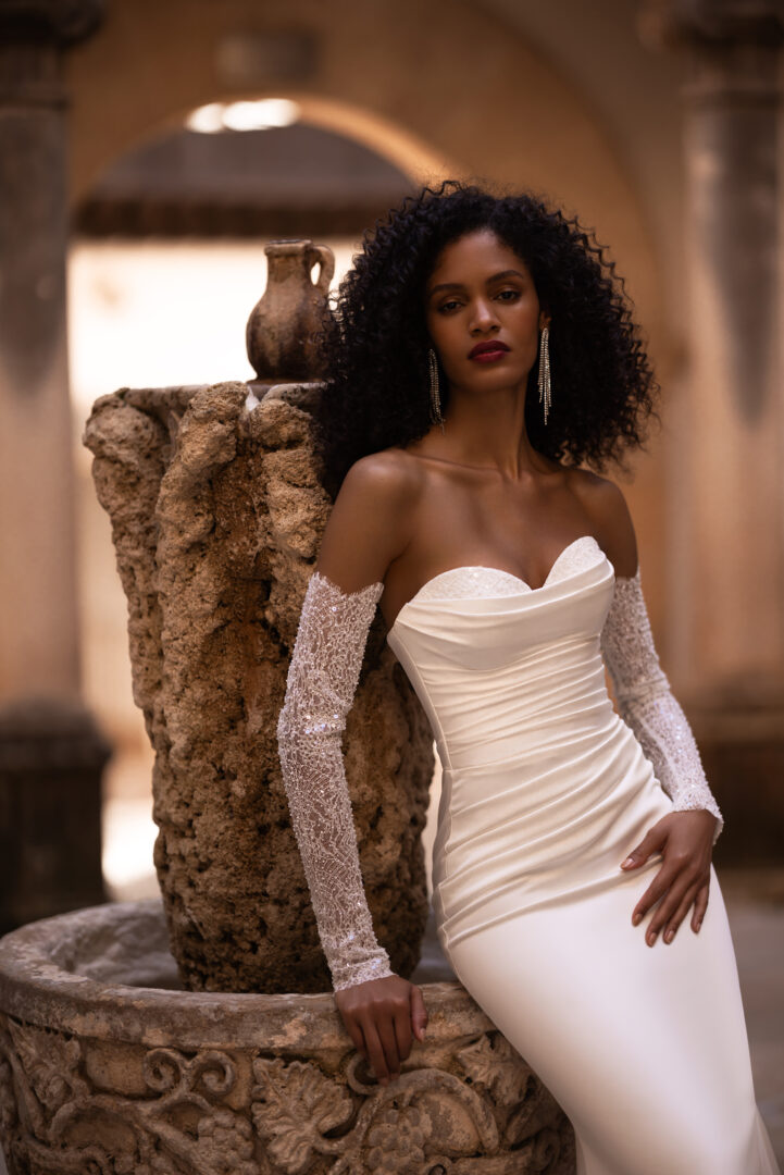 Deze bestseller uit de collectie van Wona Concept is een verfijnde zeemeermin trouwjurk. De jurk is vervaardigd uit glanzende stof die prachtig het licht vangt en je silhouet laat stralen. Het strapless korset is gedrapeerd en versierd met subtiele paillettenaccenten, wat zorgt voor een speelse diepte en structuur. De afneembare overskirt met lange sleep geeft de jurk een dramatisch en koninklijk effect.